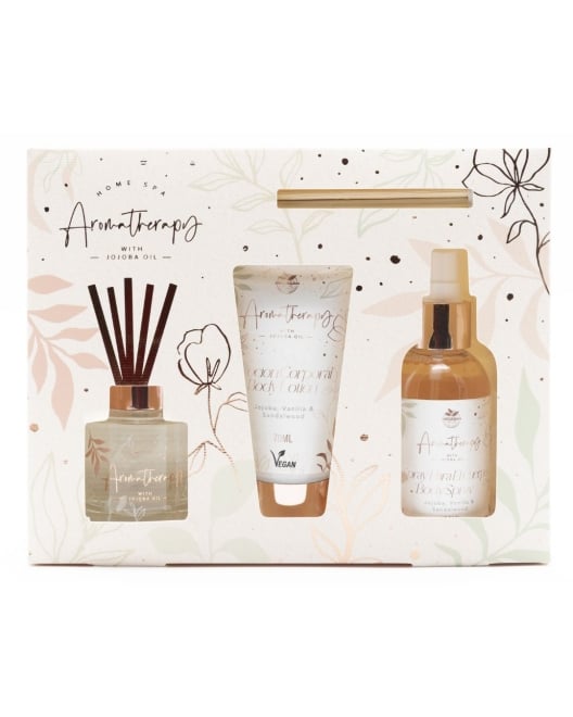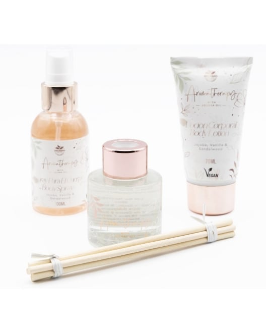 Aυτό το κομψό σετ αρωματοθεραπείας δημιουργήθηκε για να χαλαρώνει σώμα και πνεύμα χάρη στον συνδυασμό jojoba, βανίλιας και σανταλόξυλου. Σε ένα διακοσμητικό και εκλεπτυσμένο κουτί, είναι το τέλειο δώρο!